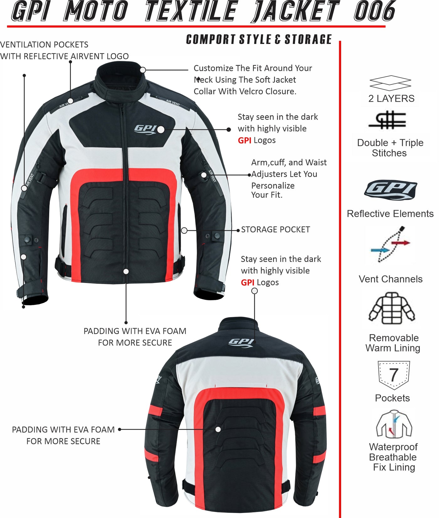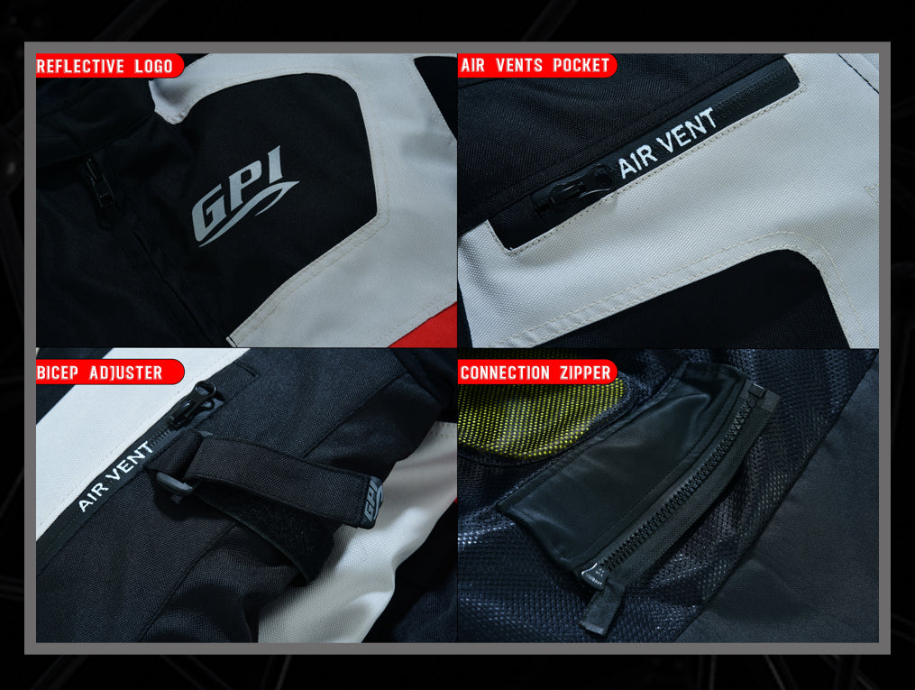 - Pants Attachment Zipper: Designed to seamlessly connect with GPI Moto riding pants, offering added safety and stability during rides.