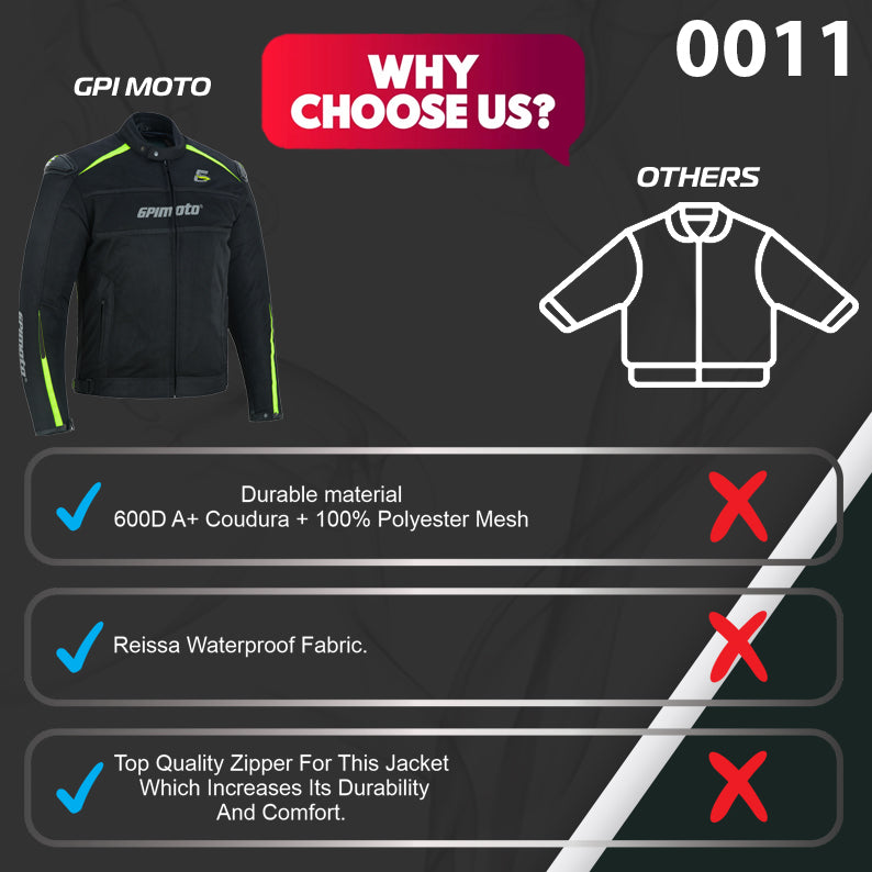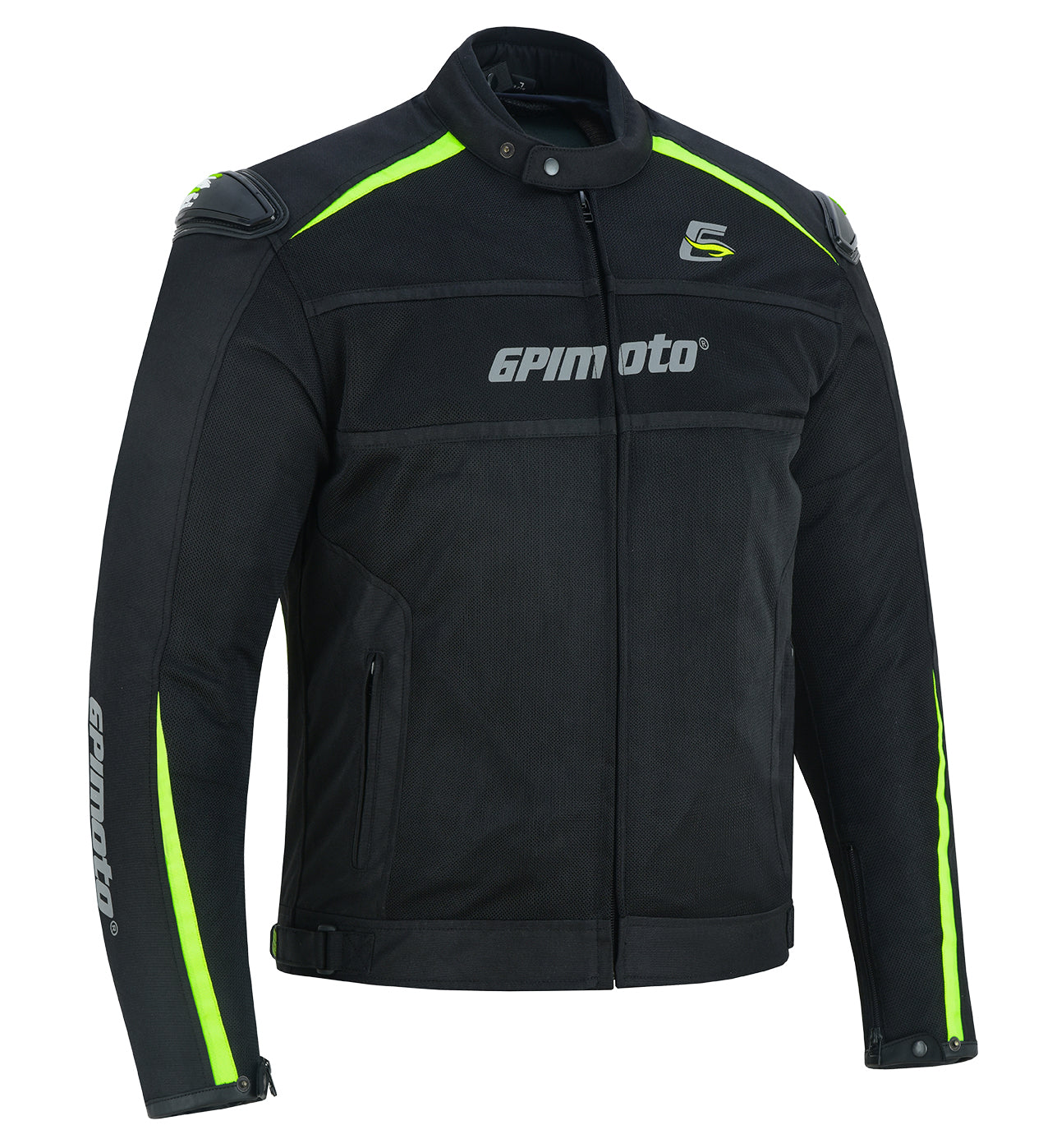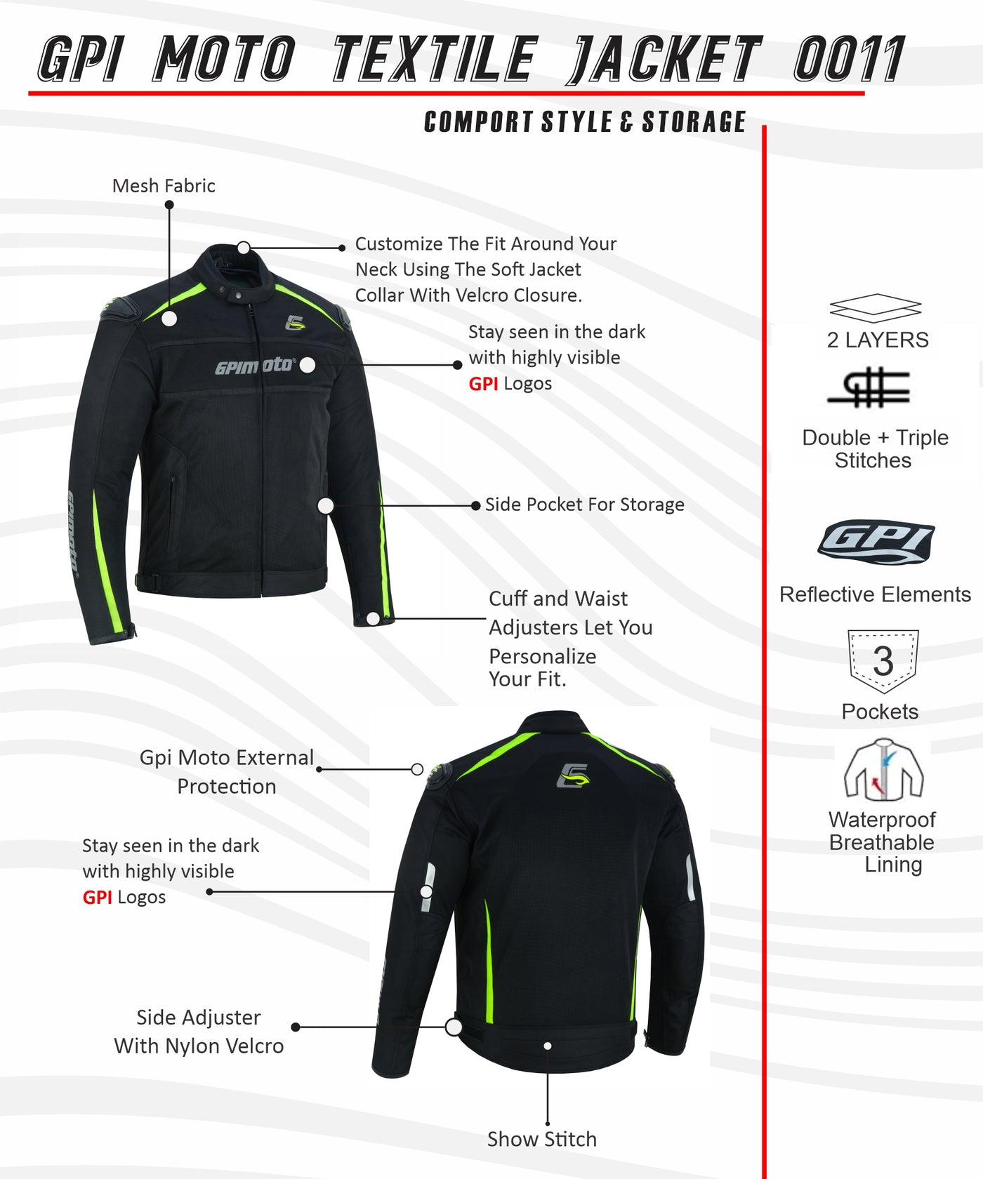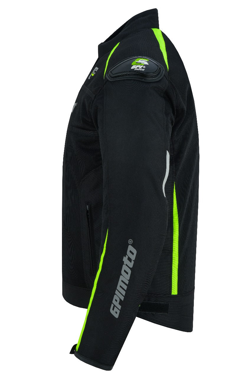 The Black/Fluorescent Motorcycle Jacket by GPI Moto is a waterproof, high-quality, durable jacket. Perfect for Summer weather, the Cordura outer shell is 100% waterproof and windproof. This jacket offers excellent mobility and performs well in any weather conditions!