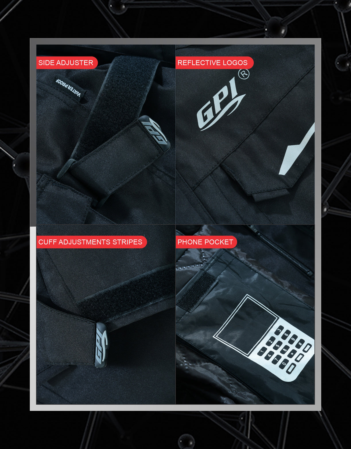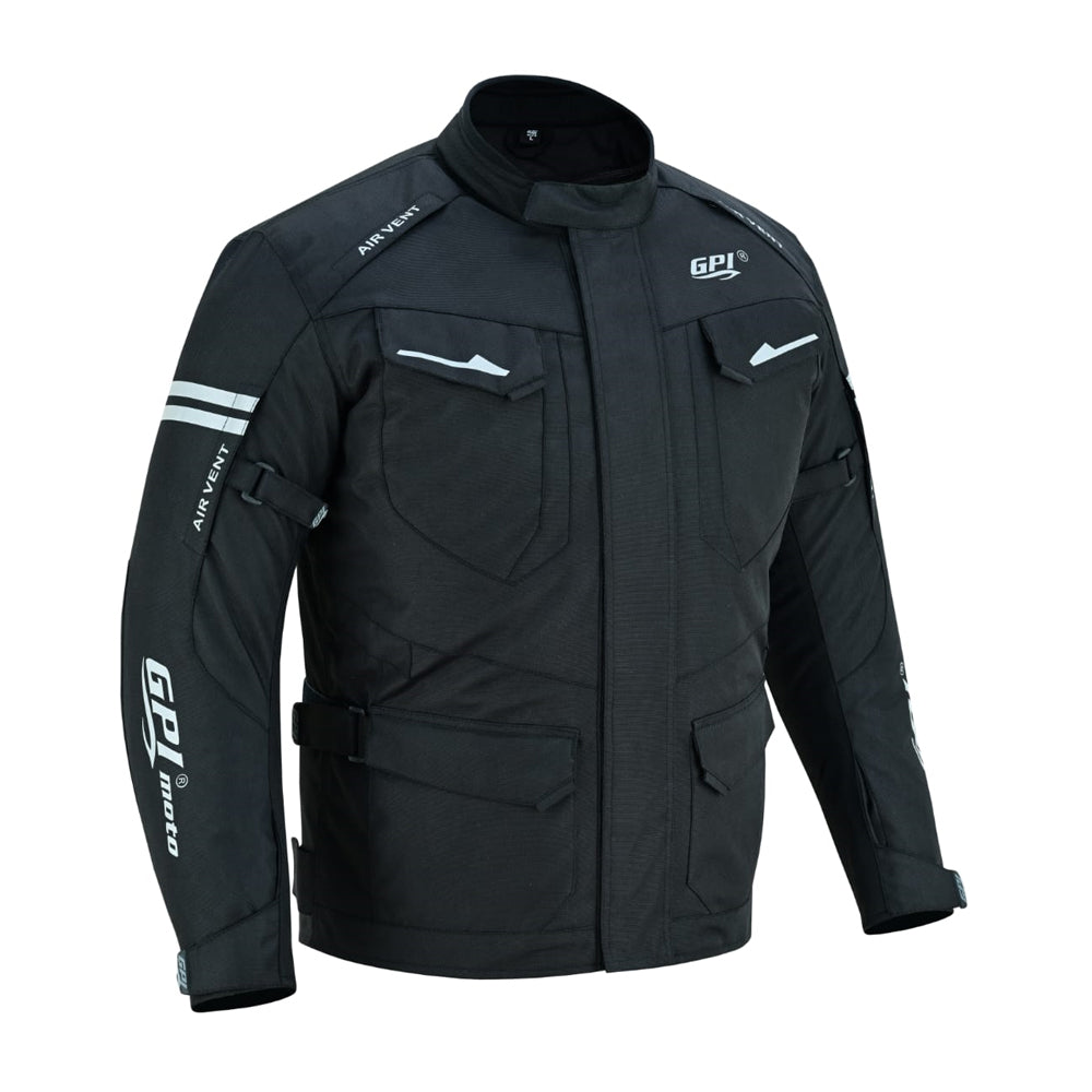 The Full Black Jacket by GPI Moto is a waterproof, high-quality and durable jacket. Perfect for all types of weather, the Cordura outer shell is 100% waterproof and windproof. This jacket offers excellent mobility and performs well in any weather conditions!