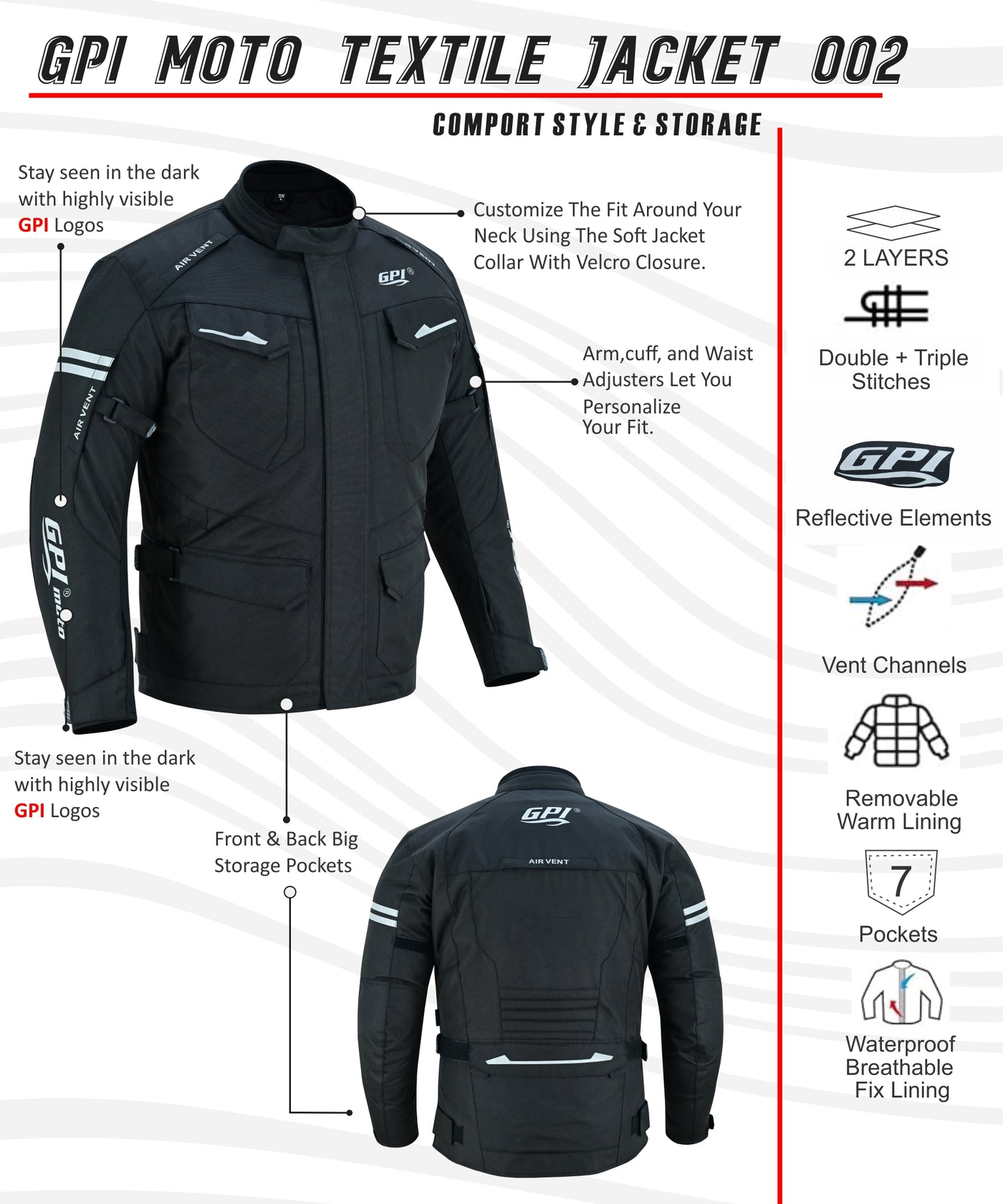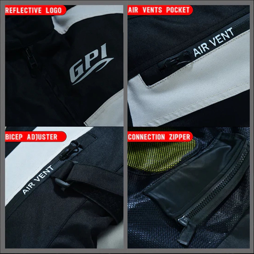 - Pants Attachment Zipper: Designed to seamlessly connect with GPI Moto riding pants, offering added safety and stability during rides.
